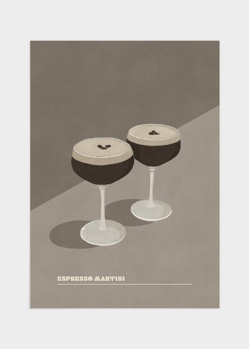 Espresso martini-motiv i stilren retrostil. Espresso martini är en kall drink gjord på espresso, kaffelikör och vodka. Motivet går i beiga och mörk...