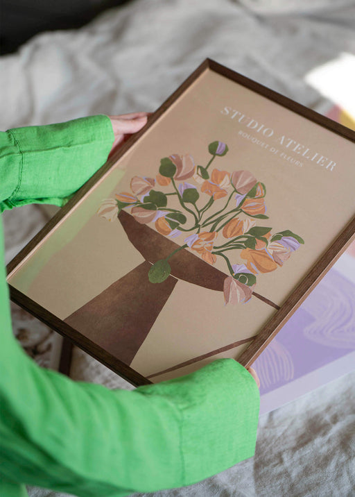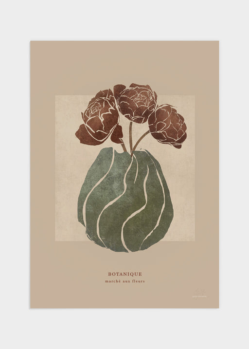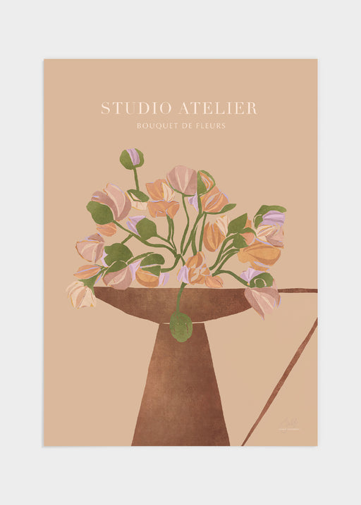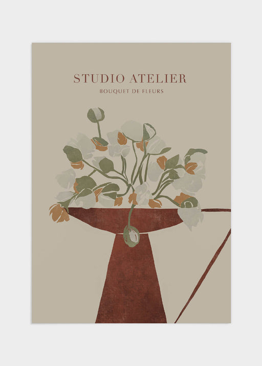 "Studio Atelier", trendigt motiv i mjuka toner. Den rostbruna krukan/vasen bjuder på en spännande struktur och blommorna spretar lekfullt åt olika ...