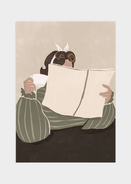 Trendig illustration av Julia M.Gustafsson i jordnära toner. Motivet föreställer en kvinna iklädd en grön blus med ränder, kvinnan dricker sitt mor...