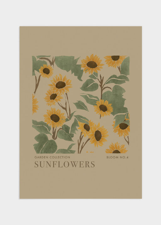 Trendigt motiv med solrosor i gula och bruna toner. Bakom och runt om blommorna är det gröna löv i dova och diskreta toner. Ge sovrummet en lugn kä...